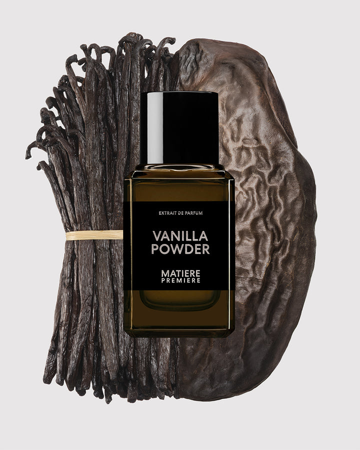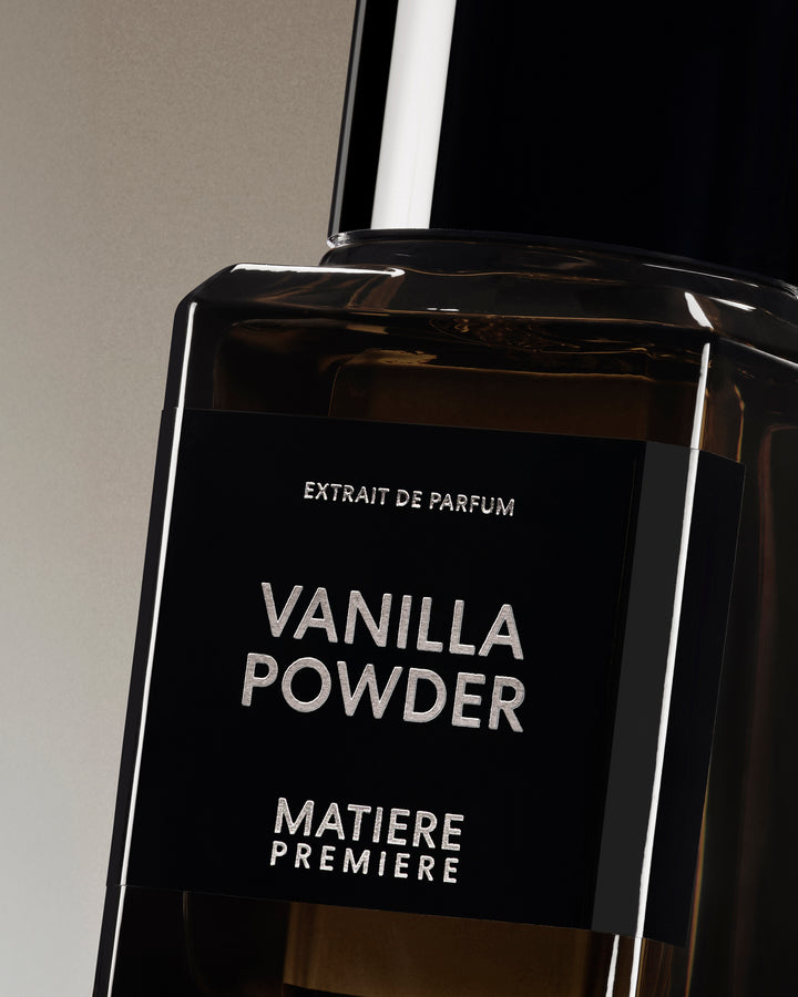 MATIERE PREMIERE's Vanilla Powder is a unique take on vanilla, built on the contrast between the dark richness of its main natural ingredient, Vanilla Absolute Fair for Life Madagascar, and an overdose of modern white powders. To create Vanilla Powder Extrait, Founder and Perfumer Aurélien Guichard has enriched the original Eau de Parfum with guest ingredient Tonka Bean Absolute Venezuela. Combined with a higher perfume concentration and an even higher dosage of vanilla absolute, the tonka bean is used as a natural powder ingredient to bring a voluptuous facet and intensify the addictive character.